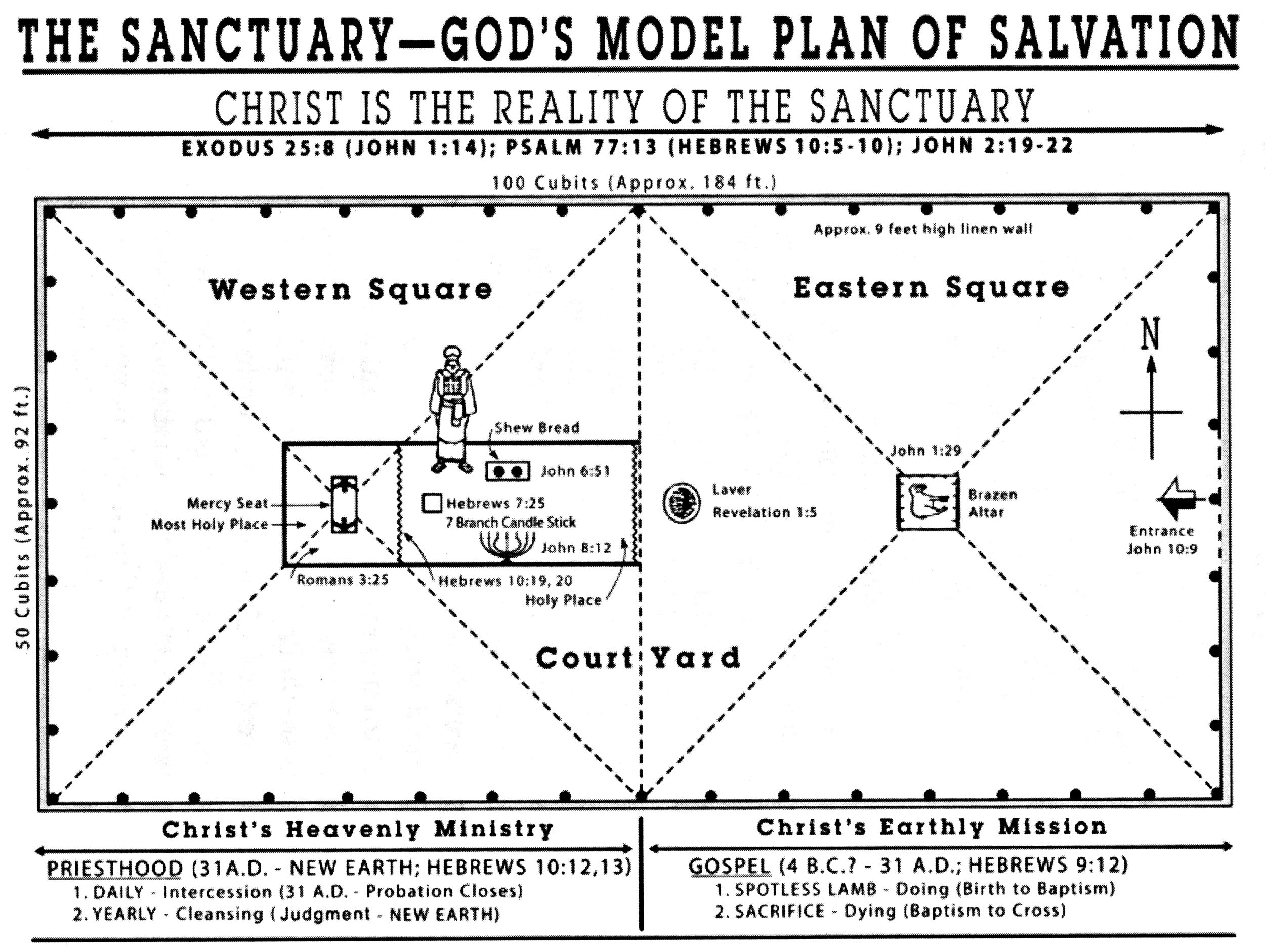 Both squares had two phases. The eastern square represents the earthly ministry of Christ which points to two things — His doing and His dying. The sanctuary unfolds Christ’s earthly mission. Hebrews 9:12 tells us that Christ obtained for us eternal redemption:
